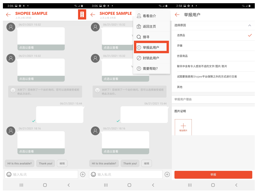 方法二:找到与该买家聊天记录 → 点击右上角的「…」→ 点击「举报此用户(Report User)」→ 选择举报原因 → 点击「提交(Submit)」