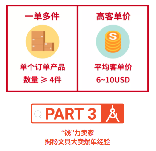 如何抓准文具类目的营销核心,实现爆单?爆单公式:“一单多件”+“高客单价”助你轻松上车。在文具类目,单个订单产品数量≥4件的情况非常多,平均客单价能达到6-10美金,这样即使一件单价不高也不用担心利润问题。