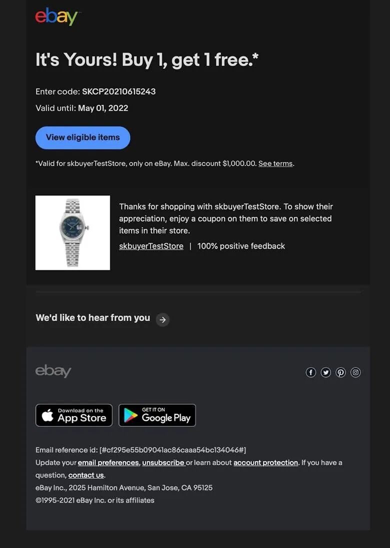 促销活动的最大预算和其他经济条件:卖家可以免费使用编码优惠券工具,eBay也不会在买家使用优惠券结帐时收取任何费用。