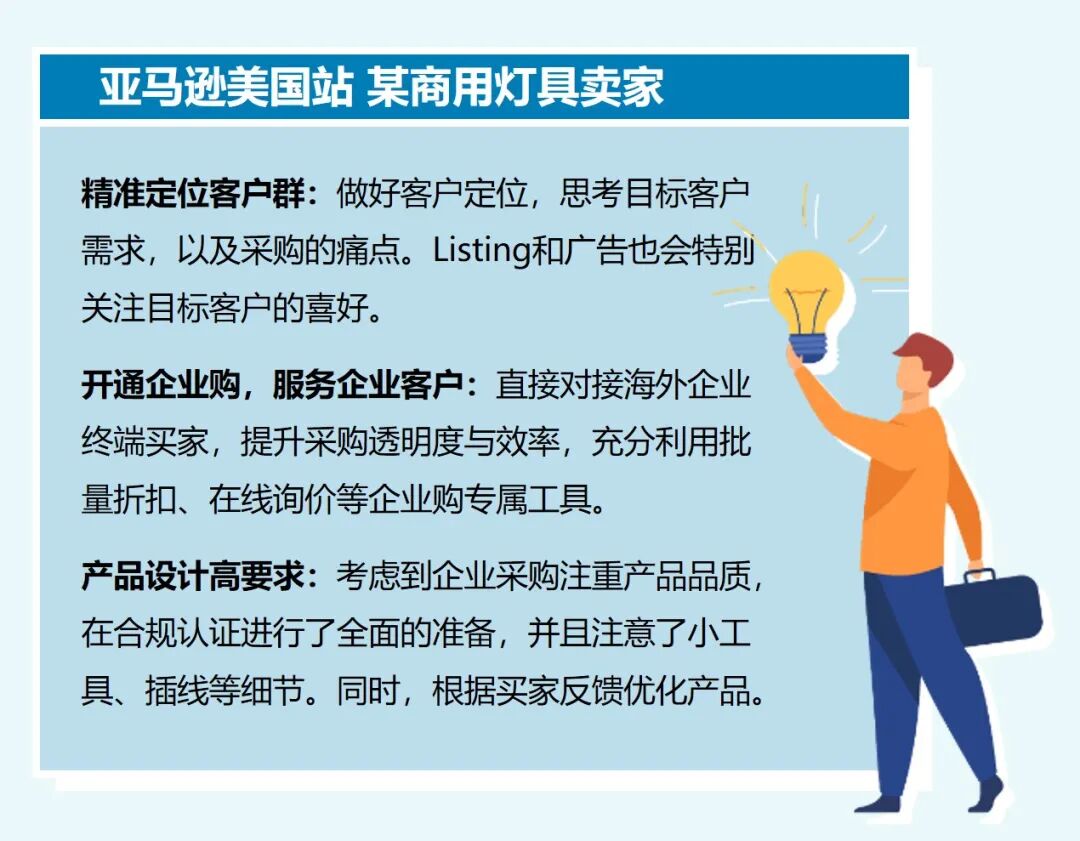 除了选品外,产品运营也至关重要!掌握运营技巧,才能刺激销量,打开照明灯具市场,打动个更多企业级买家!跟着小编一起看看商用灯具卖家的运营案例,学学经验吧!