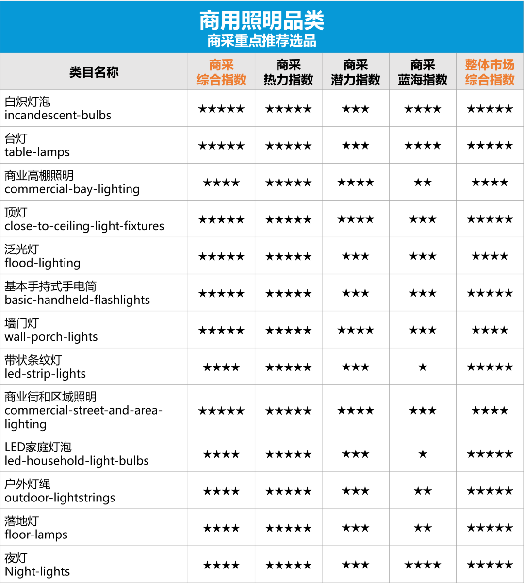 广阔的商用照明市场近在眼前,是时候找准选品方向!综合考虑了品类的市场规模、增长情况、企业销售占比、中国卖家竞争力等情况,小编为大家整理了一份商用照明品类热门榜单,满满干货助您火速pick潜在爆款,即刻进入大卖快车道!