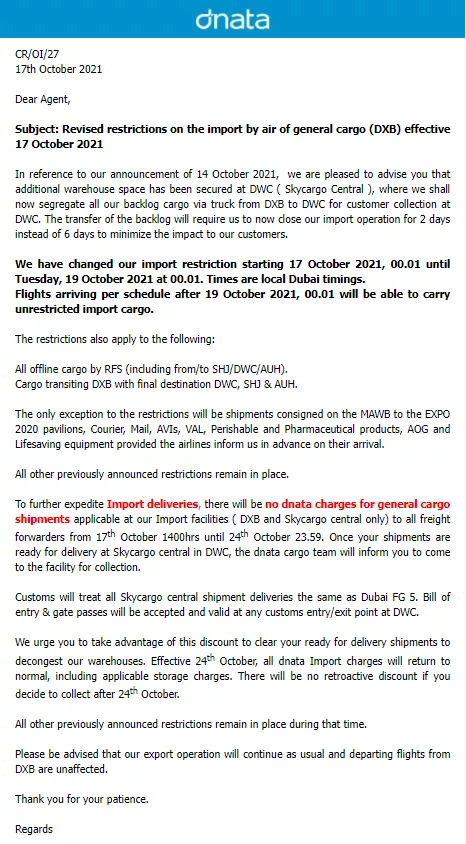 在 10 月 17 日,Dnata 再出新通知,表示目前已经解决了这个问题,在 17 日到 19 日里,暂停进口,并且将 DXB 的积压货物转移到 DWC,缓解一时的爆仓之急。