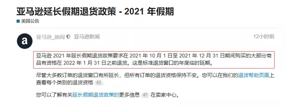 9月15日,亚马逊发布2021年延长假期退货政策,要求在2021年10月1日至2021年12月31日期间购买的大部分商品有资格在2022年1月31日之前退货。