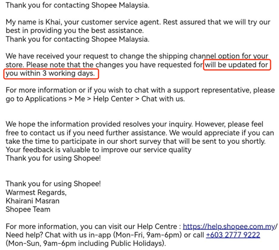 针对这些问题,有卖家向 Shopee 反馈后获悉,卖家可以通过提交表格进行更换物流伙伴,如果情况属实且可以调整,会在 3 个工作日内进行办理。