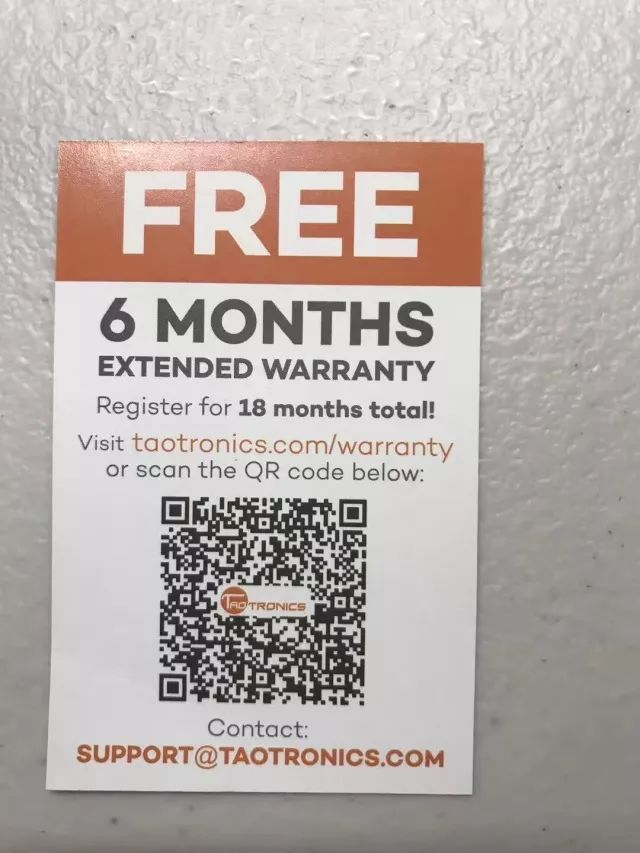 质保卡的正面写道,你如果到Taotronics官网注册,可以获得额外6个月的质保;泽宝这是为了获取你的邮箱,以便通过email进行二次营销。它还可以借此收集用户画像的各种参数,以了解目标客户群体并指导新品开发等。