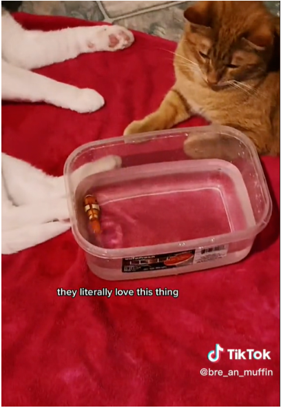 根据TikTok 用户 @Bre_an_muffin 发布的一段视频,她家里的猫咪们聚在一个小水缸旁边,看着主人新买的“宠物鱼”在水里游动着。