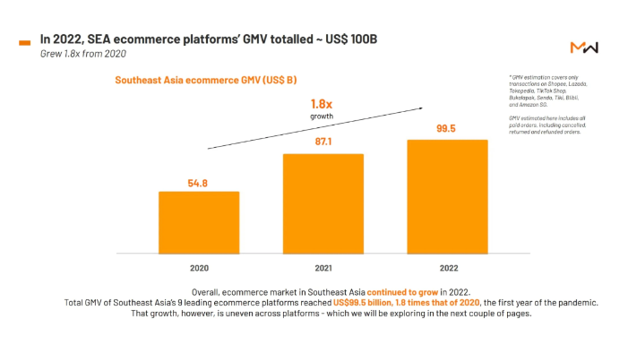 昨天,Momentum Works 发布了东南亚电商报告,数据显示,2022 年,Shopee、Lazada、Tokopedia 等九大电商平台的 GMV 同比增长 14%,达到 995 亿美元,是 2020 年的 1.8 倍。