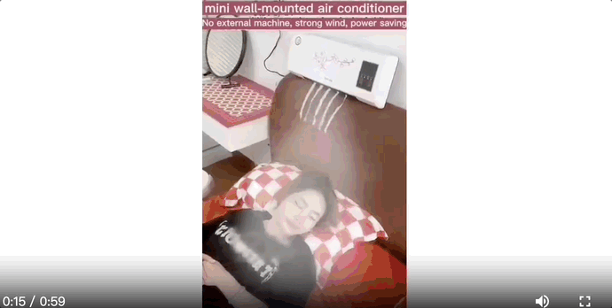 用出风口被快速吹动的纸条和白雾状的风来体现出风量大和温度低,男士和女士都可以用一只手拿起,说明空调体积小、重量轻,有人放在床头靠背上用,有人放在床头柜上用,有人挂在化妆桌前的墙壁上,往墙上一贴就能出风,暗示安装方便,视频时长有59秒,重复的信息也很多,用反复讲述来加深用户记忆点。