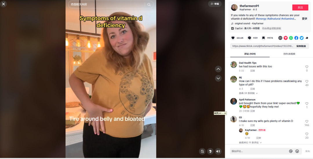 今年4月3日,TikTok博主 @thefarmers91 一则简单直白的视频,直接将Micro Ingredients旗下一款维生素产品送出圈,该视频获得了400万观看量和6.86万点赞。视频下面的近千条评论中,网友纷纷表示自己和自己身边的人都有这种症状,甚至直接求购买链接。