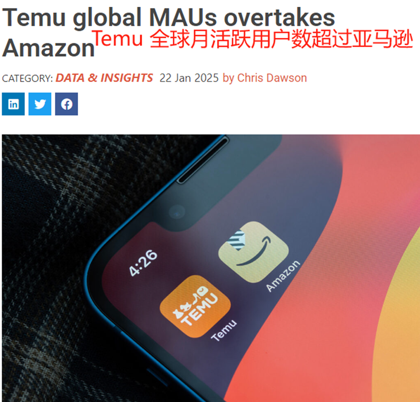 2025年1月22日,美国顶级金融机构Bernstein reports报告显示,Temu月活用户数超越亚马逊,成为全球最高的电商平台。其2024年GMV突破500亿美元,预计2025年达700-800亿美元,欧美市场贡献超70%增量。低价策略吸引海量用户,上线仅两年覆盖80+国家。
