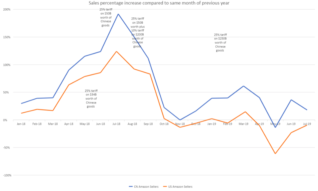 自2018年11月以来,总部位于美国的亚马逊卖家的月销售额逐月下降。到2019年3月,当美国对中国商品2500亿美元征收25%的关税时,中国供应商过去一年的销售额增长了61%,但美国卖家的销售额下降了3%。